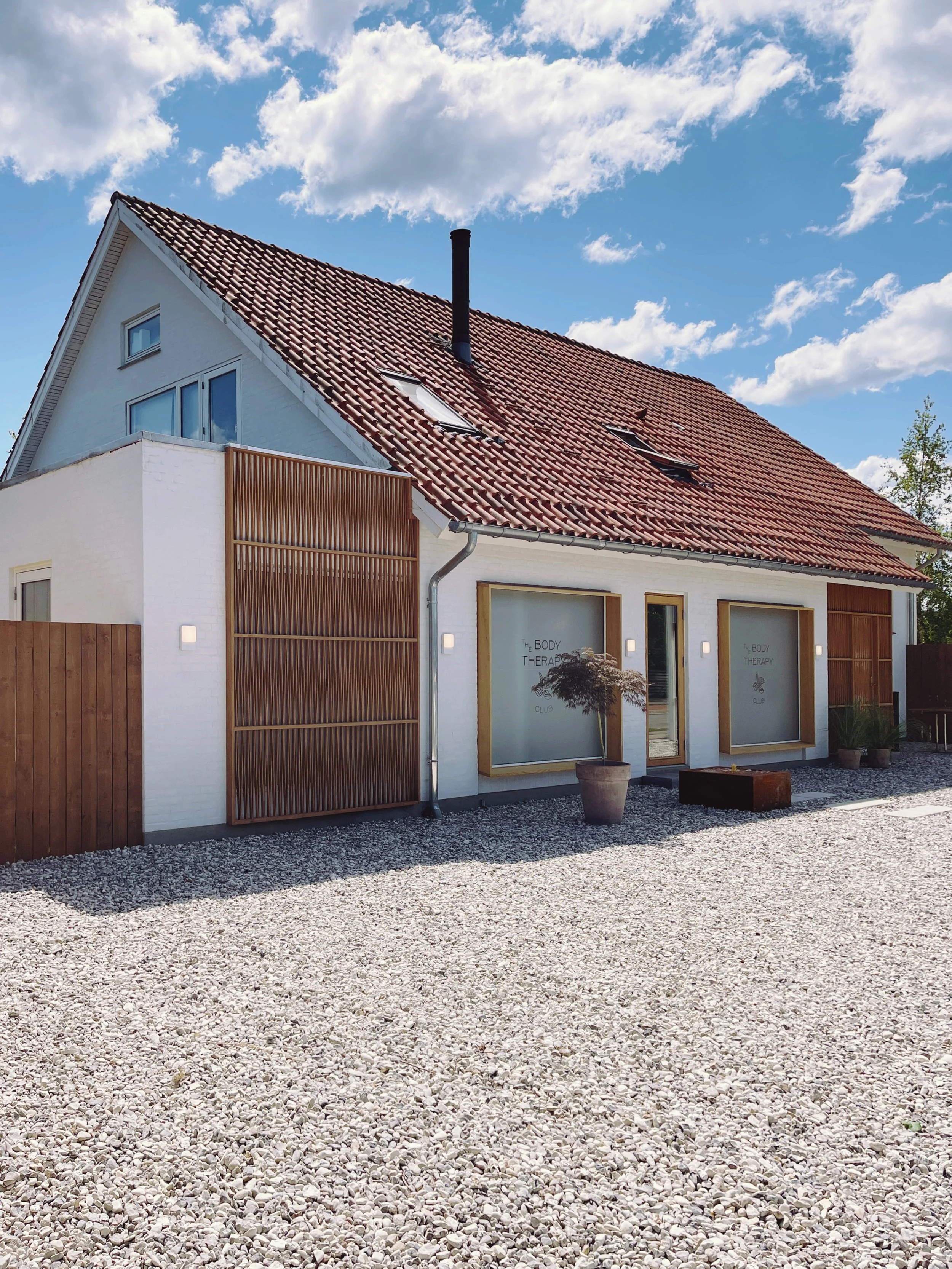 Rare atelier has used a color palette inspired by the beach that supports calm and well-being. Creating white walls to brighten the facade and warm wood tones to create an inviting and exclusive appearance. Deep wooden frames around the windows to emphasize the business premises and wooden trellises to create a unique facade which at the same time hides the private entrance area.