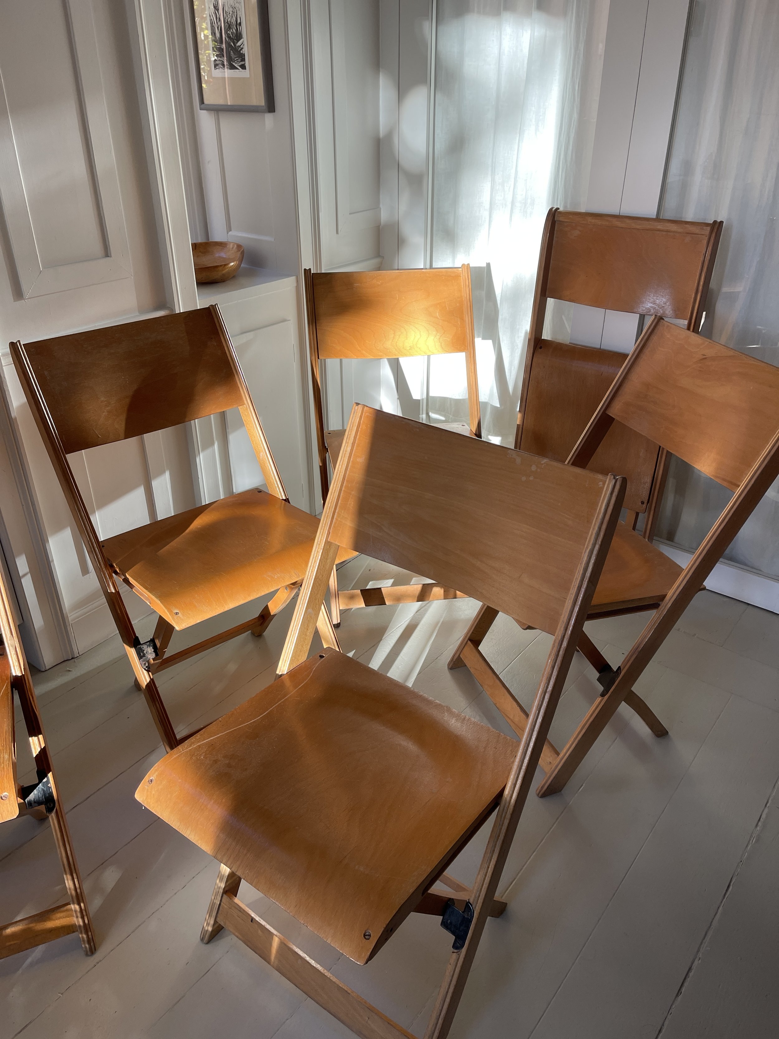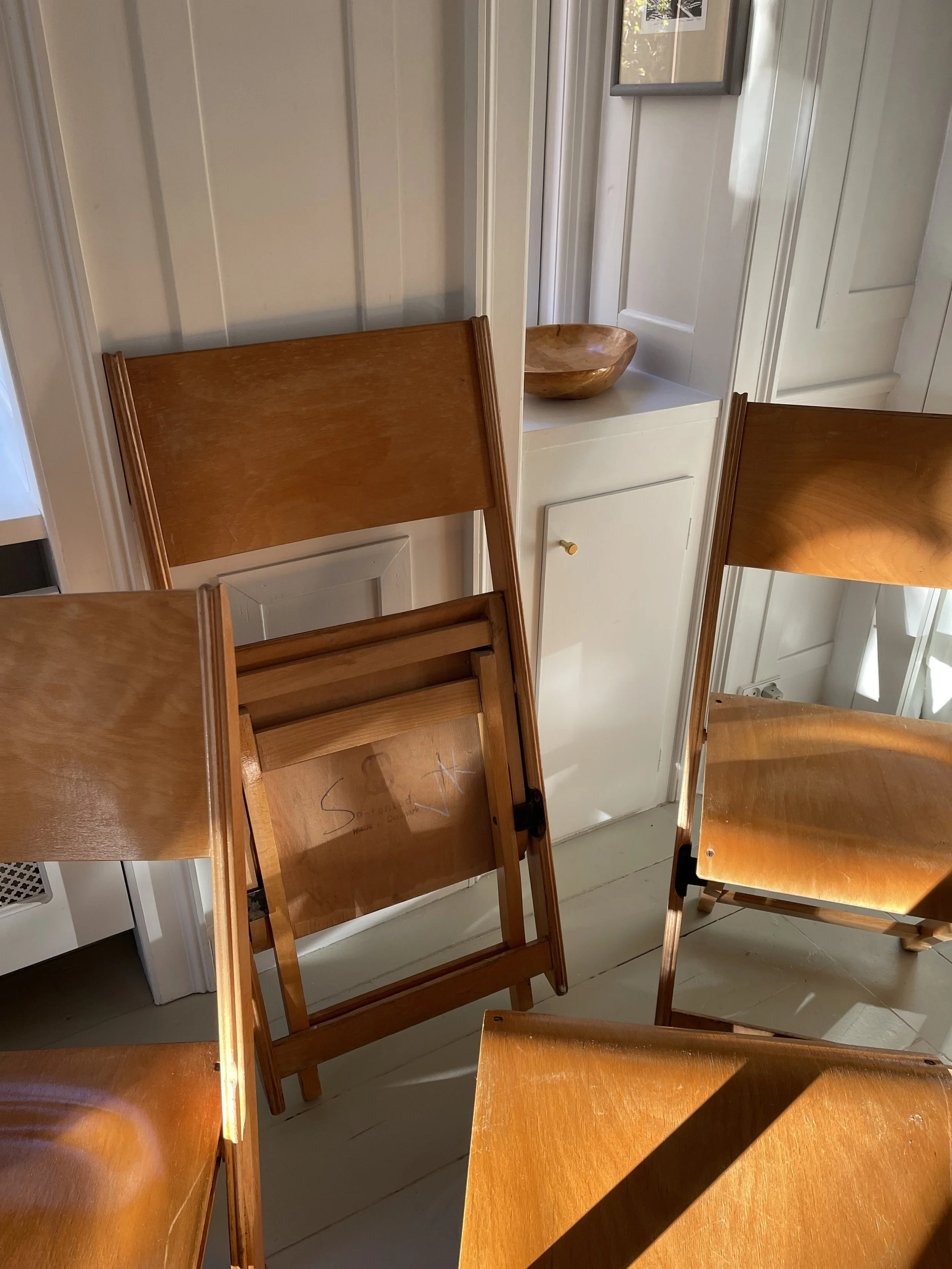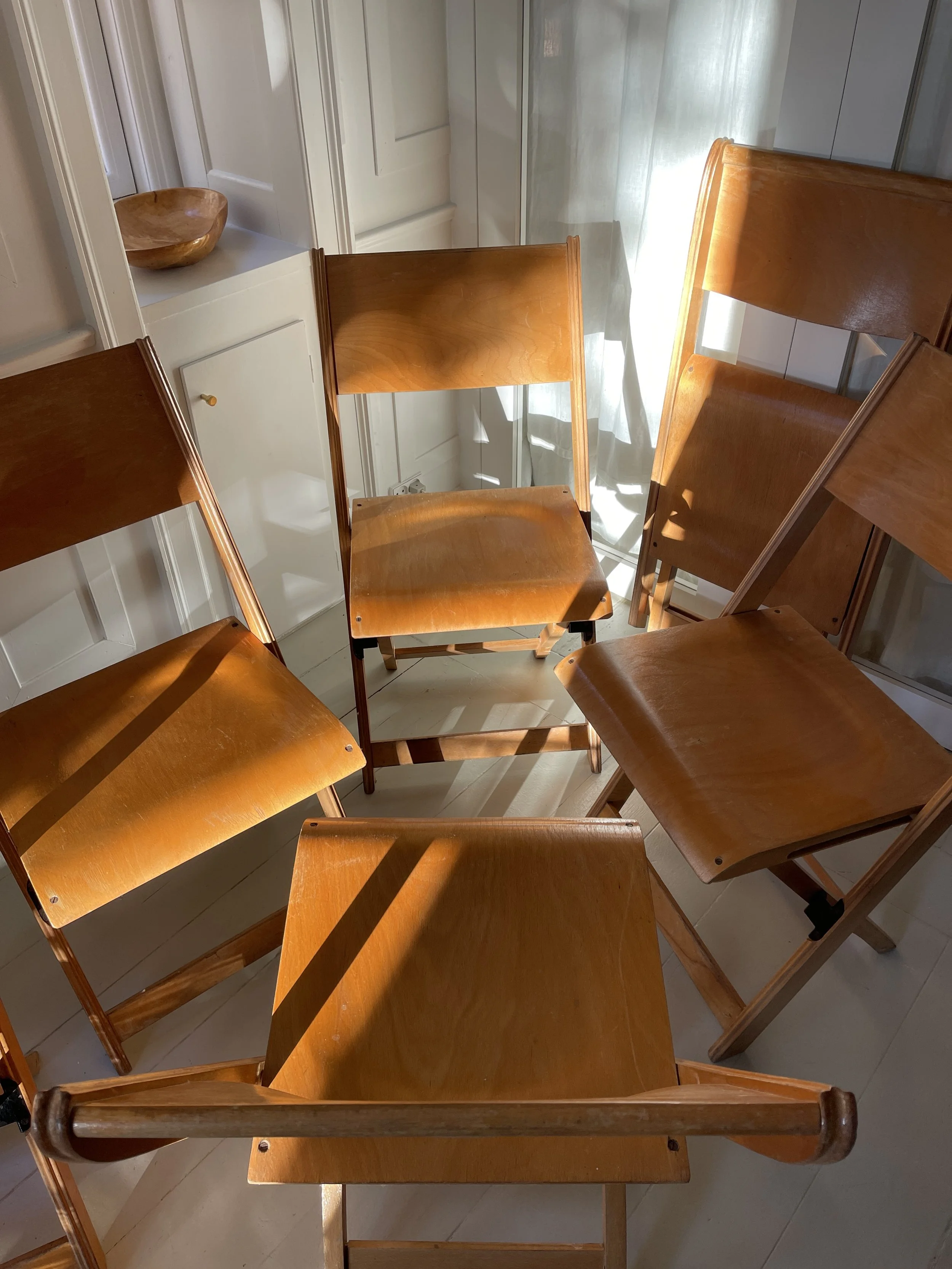 A pair of mid-century modern folding chairs in beech and canvas, possibly designed by a Danish or Swedish designer from the mid-20th century. Based on their minimalist aesthetic, functional design, and high-quality materials, they resemble pieces from the 1950s-1970s, when designers focused on space-saving solutions without compromising style.